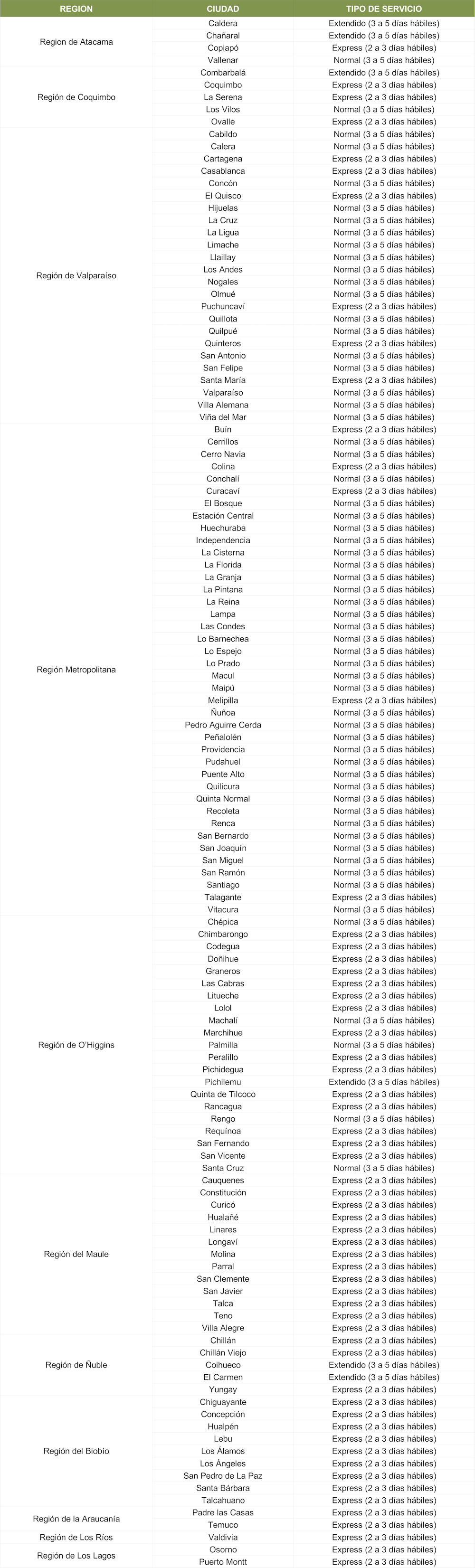 El siguiente listado contiene el detalle de ciudades en las que aplica nuestra modalidad de despacho gratis por compras sobre $50.000. Junto a la ciudad se detallan los tiempos aproximados de despacho. La selección del operador de despacho será efectuada por nuestro equipo en función de plazos y fechas próximas de retiro desde nuestras instalaciones, pudiendo ser: Bluexpress, Starken o Chilexpress.